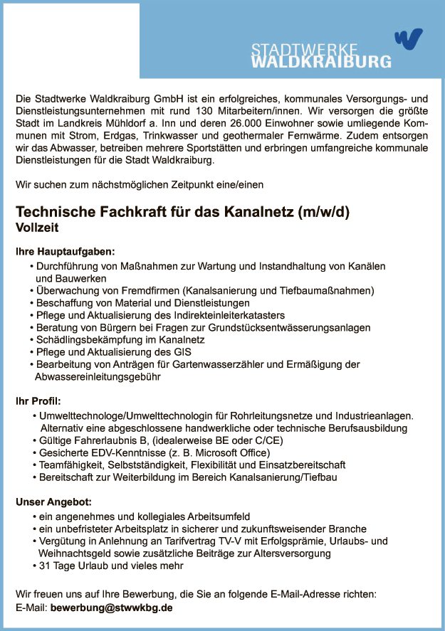 Technische Fachkraft für das Kanalnetz (m/w/d) ab sofort